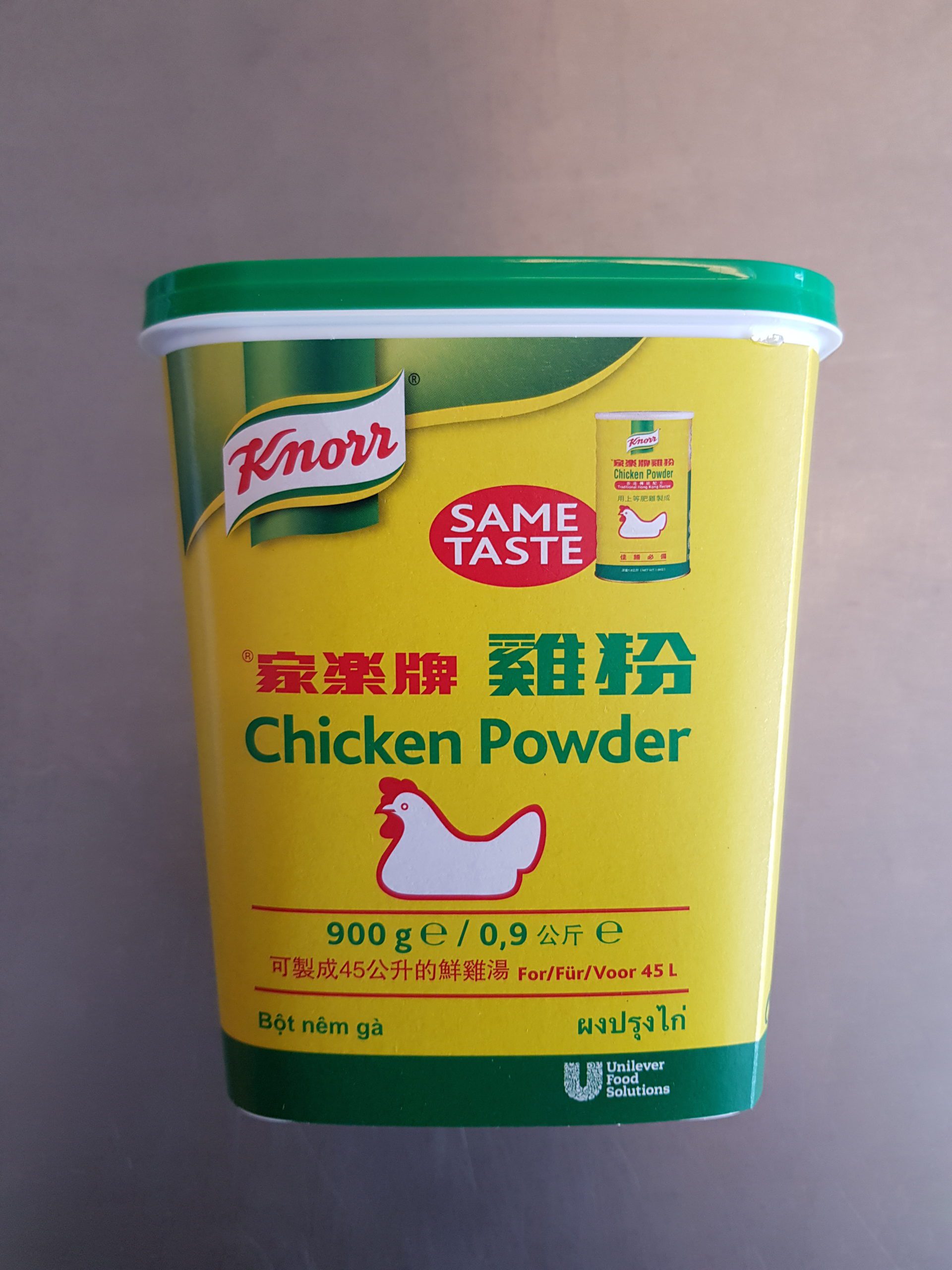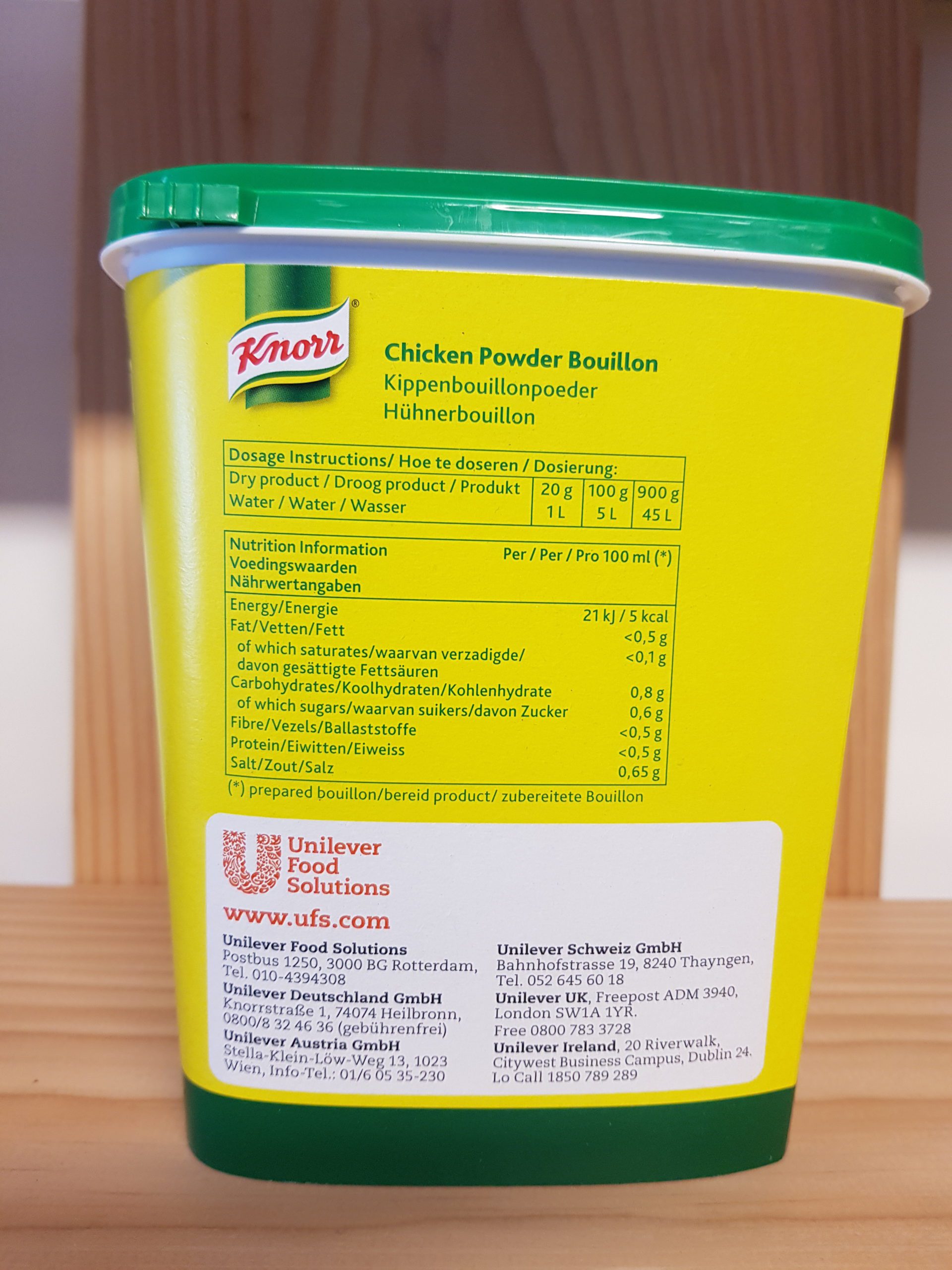 900 gram kippenbouillon poeder, goed voor 45 Liter.